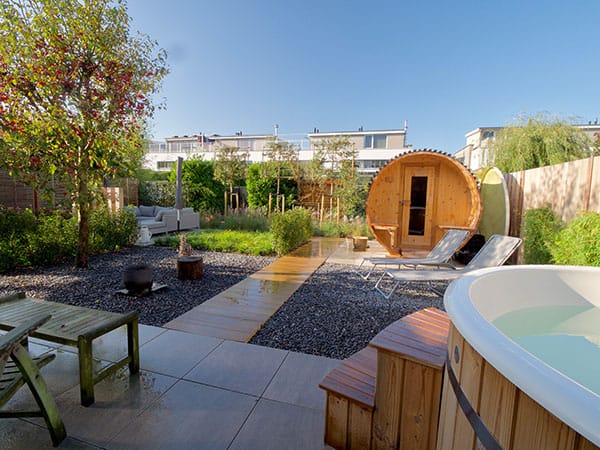 Het is een wellness tuin. Dit is een tuinstijl die erop maximaal op gericht is dat je er kunt ontspannen en rust kunt vinden. Dat komt dan ook in alles terug. De paden en terrassen zijn gemaakt met gladde, natuurlijke materialen die prettig aanvoelen, ook aan je blote voeten. De beplanting is rustgevend. Er zijn strakke lijnen gebruikt in de tuin. En de absolute blikvangers zijn uiteraard de sauna en de jacuzzi. Hier vind je foto’s van het tuinontwerp en het uiteindelijke resultaat van deze tuin. Meer lezen en bekijken? Klik dan even door naar het portfolio item.